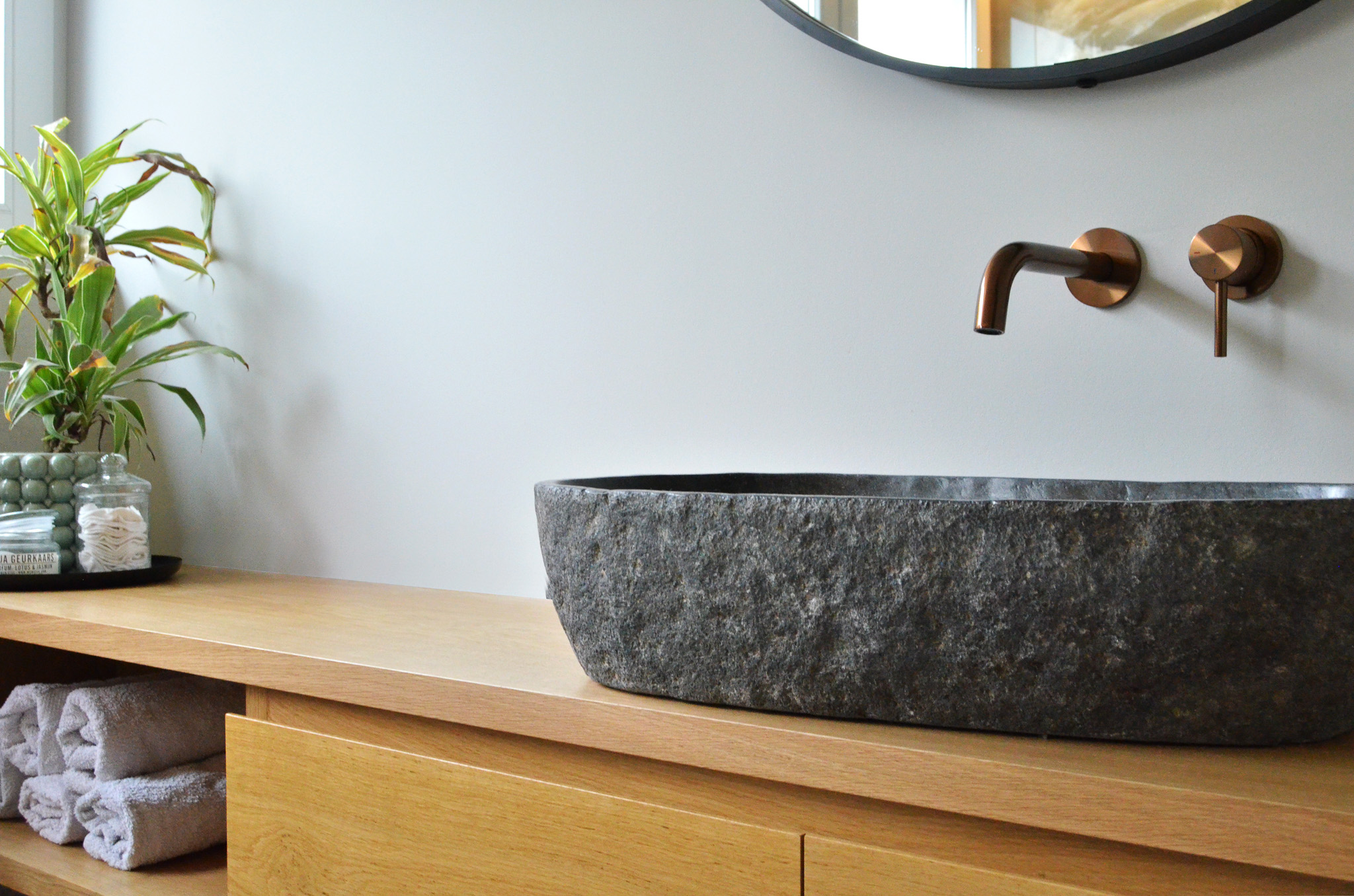 Moderne en stijlvolle vormgeving komen samen met natuurlijke materialen. Van de opvallende keramische natuursteen-look wand tot het massief eikenhouten meubel, elk element is zorgvuldig gekozen om een gevoel van luxe en ontspanning te creƫren. De lichte vloertegels vergroten het gevoel van ruimte en frisheid, terwijl de exclusieve materialen een gevoel van verfijning toevoegen.
